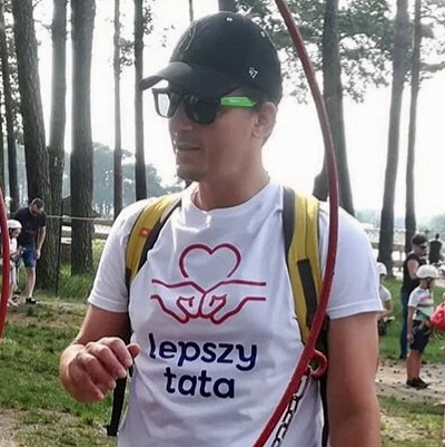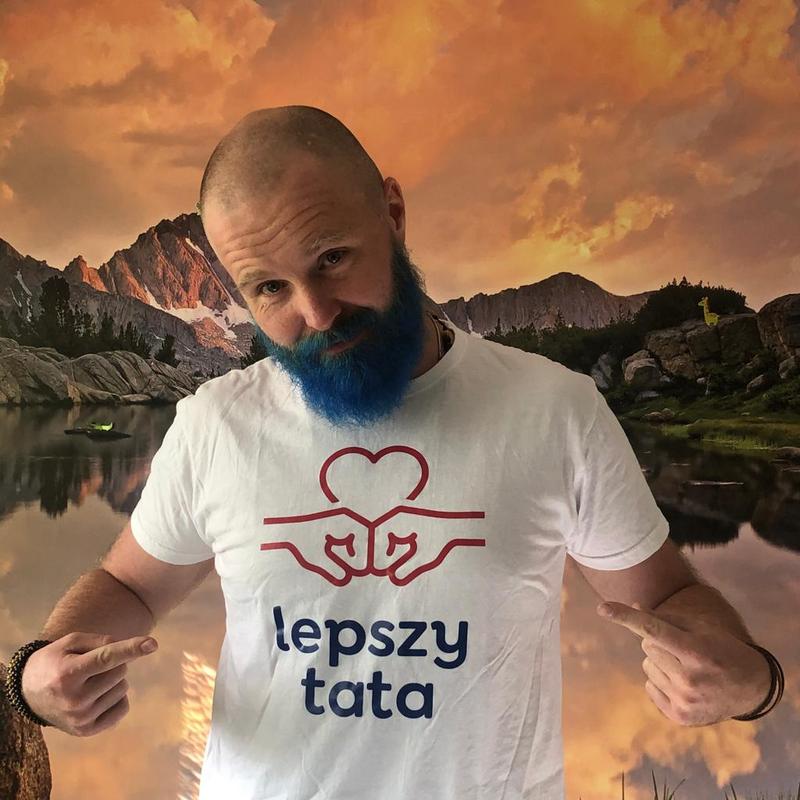 Dwukolorowy nadruk, przedstawiający logo społeczności Lepszy Tata – ojcowskie inspiracje, wykonany jest metodą termotransferu.